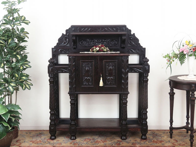 素晴らしい彫刻が施された重厚な作りのキャビネット付きのステッキスタンドです。艶の良いダークオークで存在感のある商品です。
