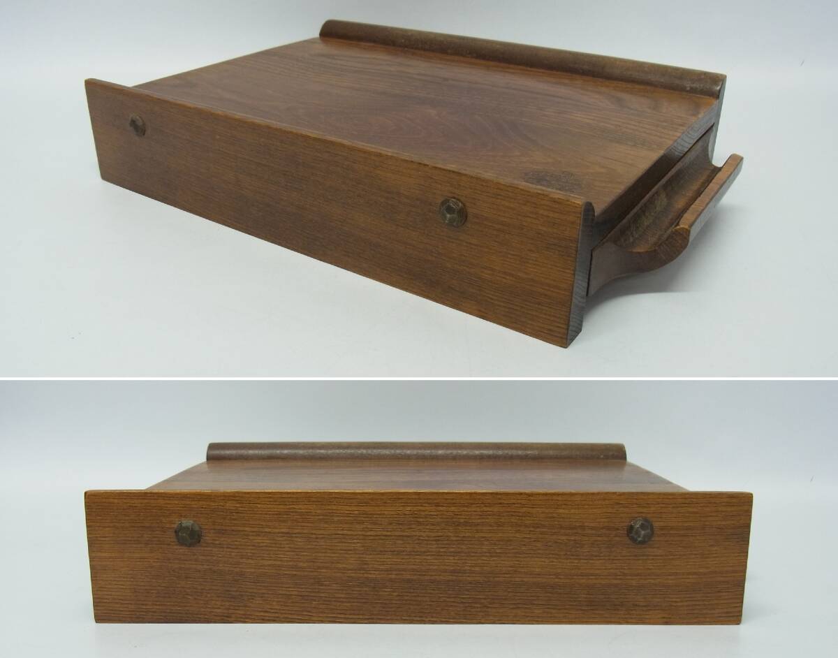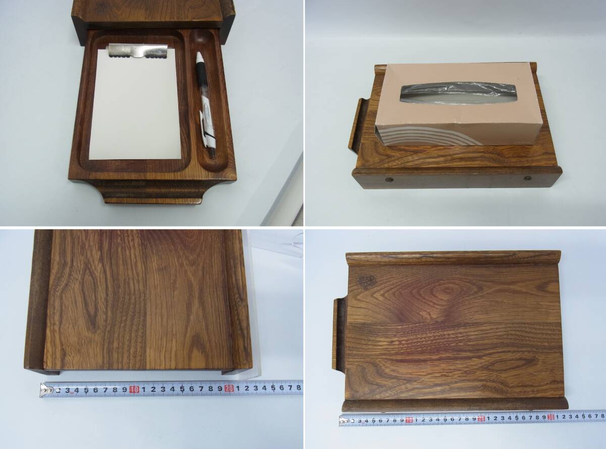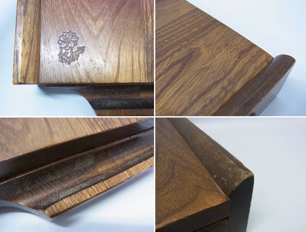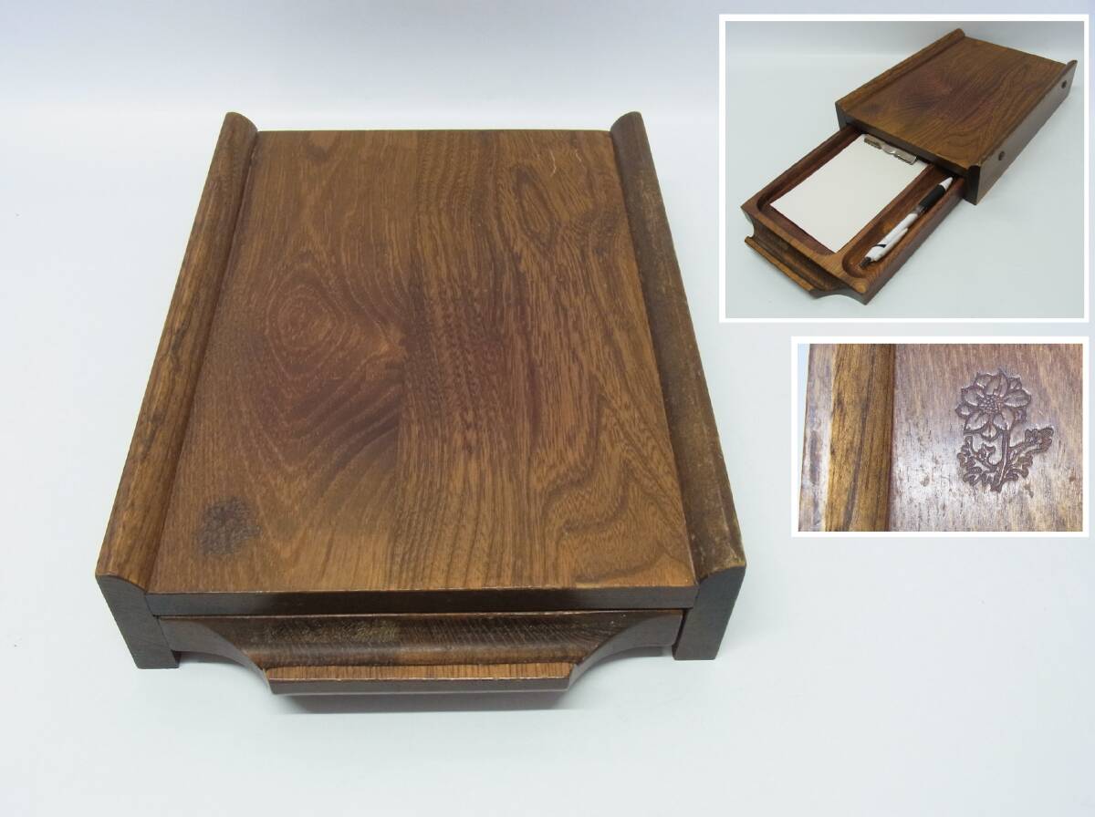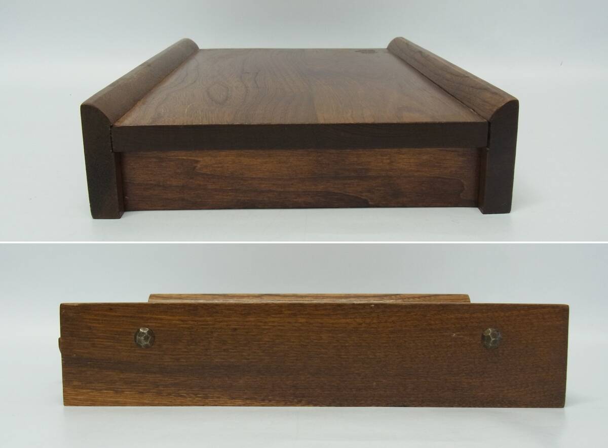 | 譲り受けた物で、本来の状態含め詳細は不明です。 画像にてお詳しい方、お分かりになる方のご判断でお願い致します。 ※画像にあるメモ紙(ハガキサイズ)とボールペンは付属しません。 スレキズやくすみ、ヤケ・色あせや汚れなどビンテージ感ございます。 使用に問題があるようなひどいガタツキなどのダメージはありません。 現状でのお渡しとなりますので、お手入れなど前提のうえ、 十分なご検討をお願い致します。 状態に関しましては画像でご確認いただき、ご判断をお願い致します。 気になる点はご入札前にご質問ください。 ※専門的な知識がありませんので、ご質問内容によっては お答え出来ない場合があるかもしれません。予めご了承ください。 木製品の中古、現状でのお渡し、経年保管品になりますので、 ご理解いただける方のご入札いただけましたら幸いです。 撮影した照明により、色合いが多少違って見えるかもしれませんが、ご了承ください。 【サイズ】 約30.8×約21×高さ約5.7センチ ※素人採寸です。多少の誤差はご了承くださいませ。 ※画像でもご確認ください。 ※画像では約22×11cmのティッシュ箱と比較もしております。 【発送方法】 ・ゆうパック/80サイズ ---------------------------------------------------------------------- ※ゆうパックの送料はお届け地域によって送料が異なりますので、 気にされる方は必ずご入札前に「質問欄」よりお問い合わせください。 | ||