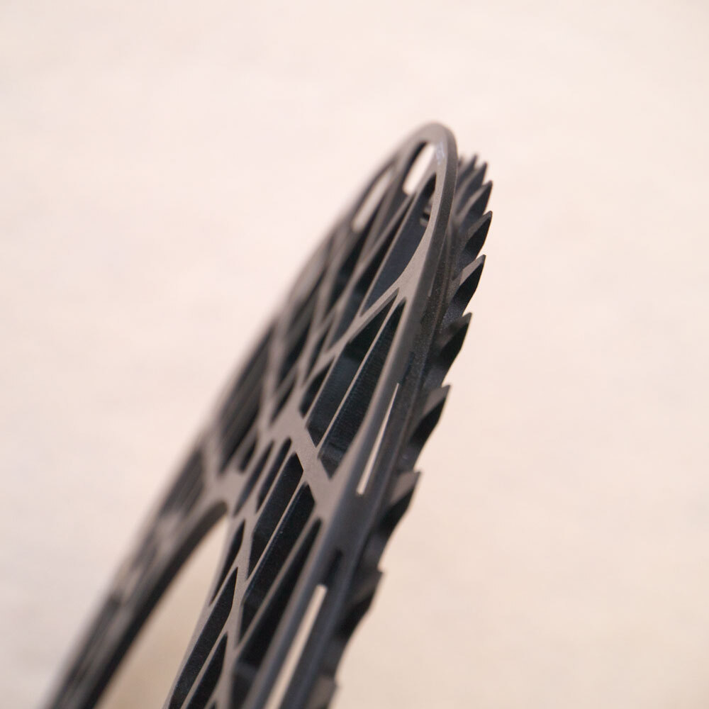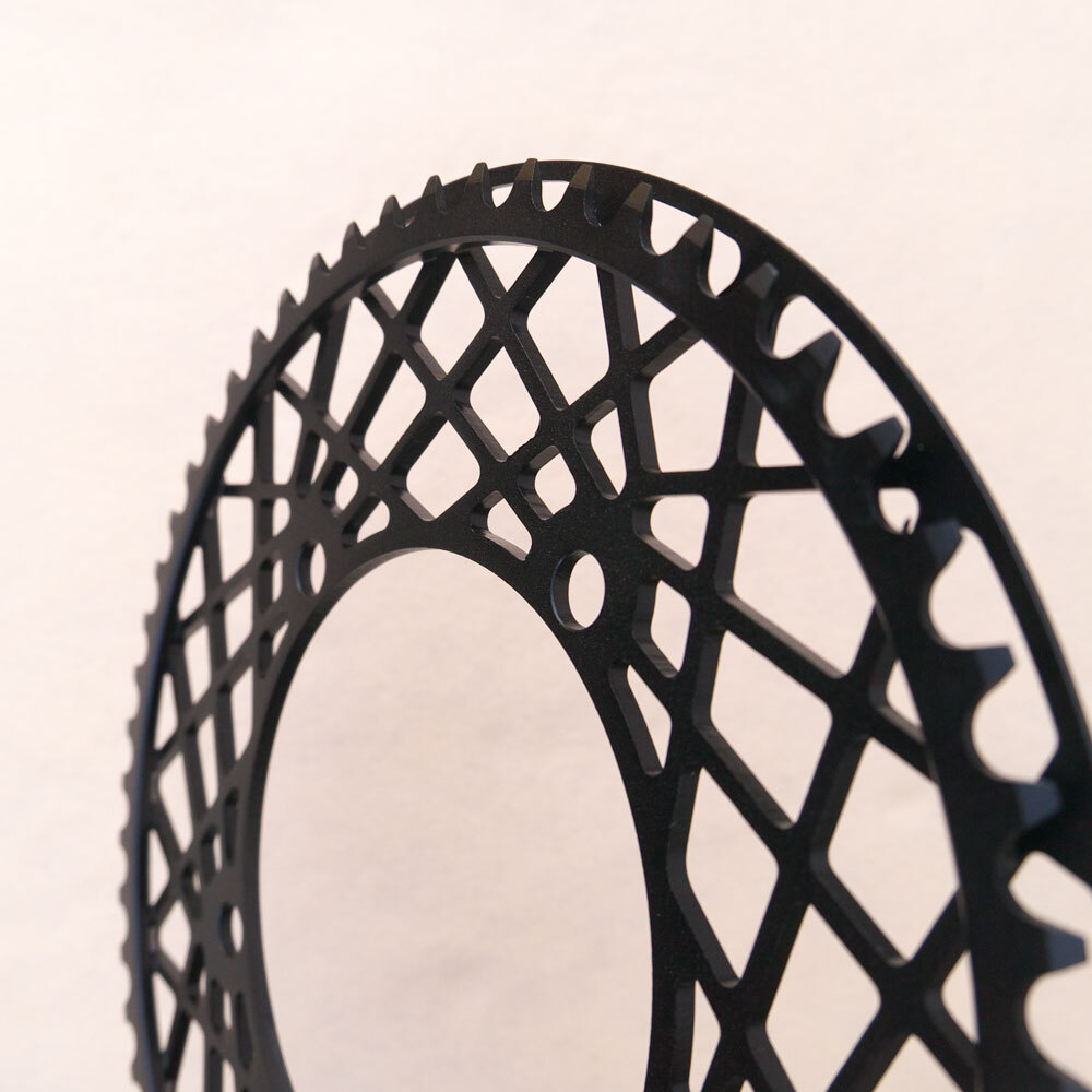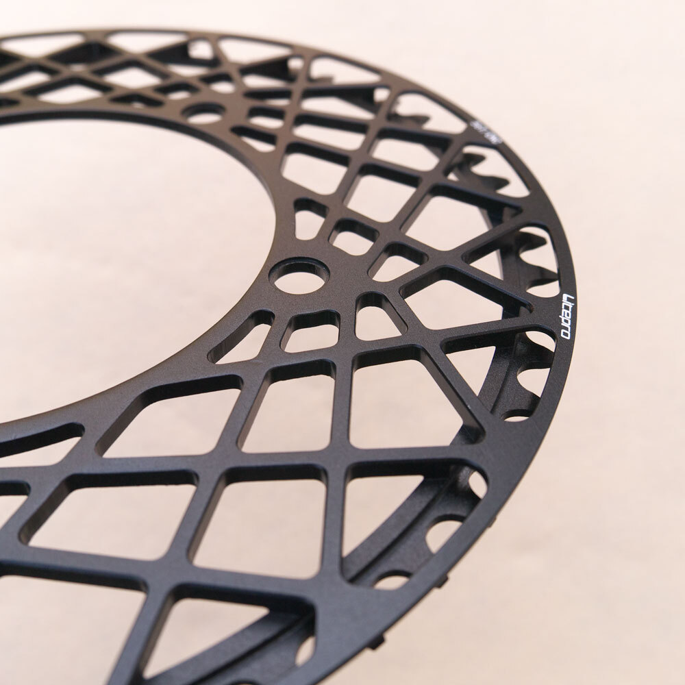 LIteproのガード一体型チェーンリング56Tです。PCD130になります。クモの巣のようなメッシュパターンが特徴です。