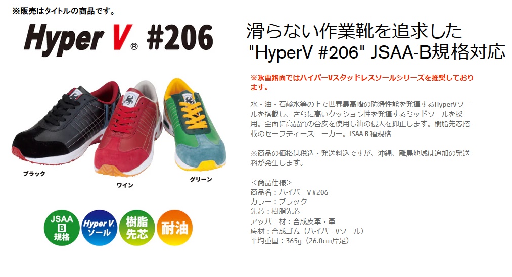 日進ゴムNISSHIN RUBBER滑らない作業靴を追求!!HyperV#206 JSAA-B規格対応サイズ:27.0cm※氷雪路面ではハイパーVスタッドレスソールシリーズを推奨しております。■特長水・油・石鹸水等の上で世界最高峰の防滑性能を発揮するHyperVソールを搭載し、さらに高いクッション性を発揮するミッドソールを採用。全面に高品質の合皮を使用し油の侵入を抑止します。樹脂先芯搭載のセーフティースニーカー。JSAA B 種規格■商品仕様・商品名:ハイパーV #206・カラー:ワイン・先芯:樹脂先芯・アッパー材:合成皮革・革・底材:合成ゴム(ハイパーVソール)・平均重量:365g(※26.0cm片足)