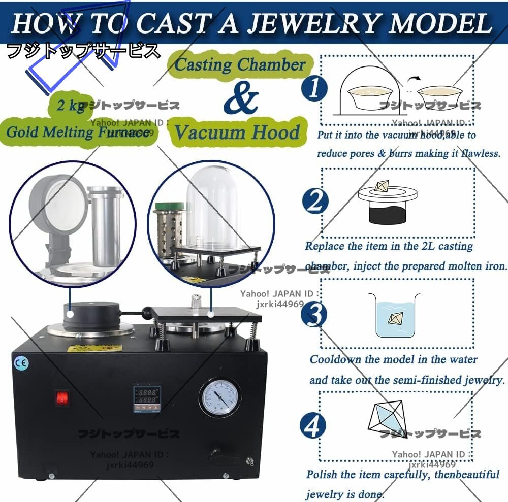状態:新品未使用 ★状態:新品未使用 金銀融解用 内部温度1100℃、2kg金属の融解40分必要!高性能で高品質:当社のプロ仕様の電気溶解炉は、1600Wのデジタル金属溶解炉を搭載し、最大6.6ポンドの金属を30分以内に完全に溶解します。グラファイトるつぼは、熱、酸、アルカリに耐え、長期間信頼できるサービスを提供します。 【安全な作業】高度で高度なデジタル制御システムを搭載し、正確で便利な金属溶解を提供します。これにより、溶解チャンバー内の実際の温度を2秒間隔で監視し、過熱や冷却を防ぎます。 1100°Cまで加熱し、48分で1100°C未満の融点で金属を溶かすことができます。ゴールドナゲット、インゴットまたはジュエリーの製造、リサイクルスクラップの製錬、宝石の精製、金、銀、鉛、銅、真鍮、青銅、アルミニウムなどのあらゆる種類の高速溶融金属の鋳造に適しています。 [真空フードと燃料タンクで構築]厚さの航空プラスチック製の真空カバーは、生成されるバルと泡を減らすのに有益です。 ビルドされた-in燃料補給機器をインストールして、参照標準ラインを介してボリュームを調整します。フードとビルトイン燃料タンク組み込みの燃料補給装置は、標準ラインを参照することにより、燃料補給額を調整するために設置されています。 正確な圧力ゲージ金属製のカバーシェルは、耐久性が良好です。 多種多様な用途が多様な用途があるため、鋳造マシンは宝石加工工場やアートワークメーカーが高密度できれいな宝石を作るのに最適です。