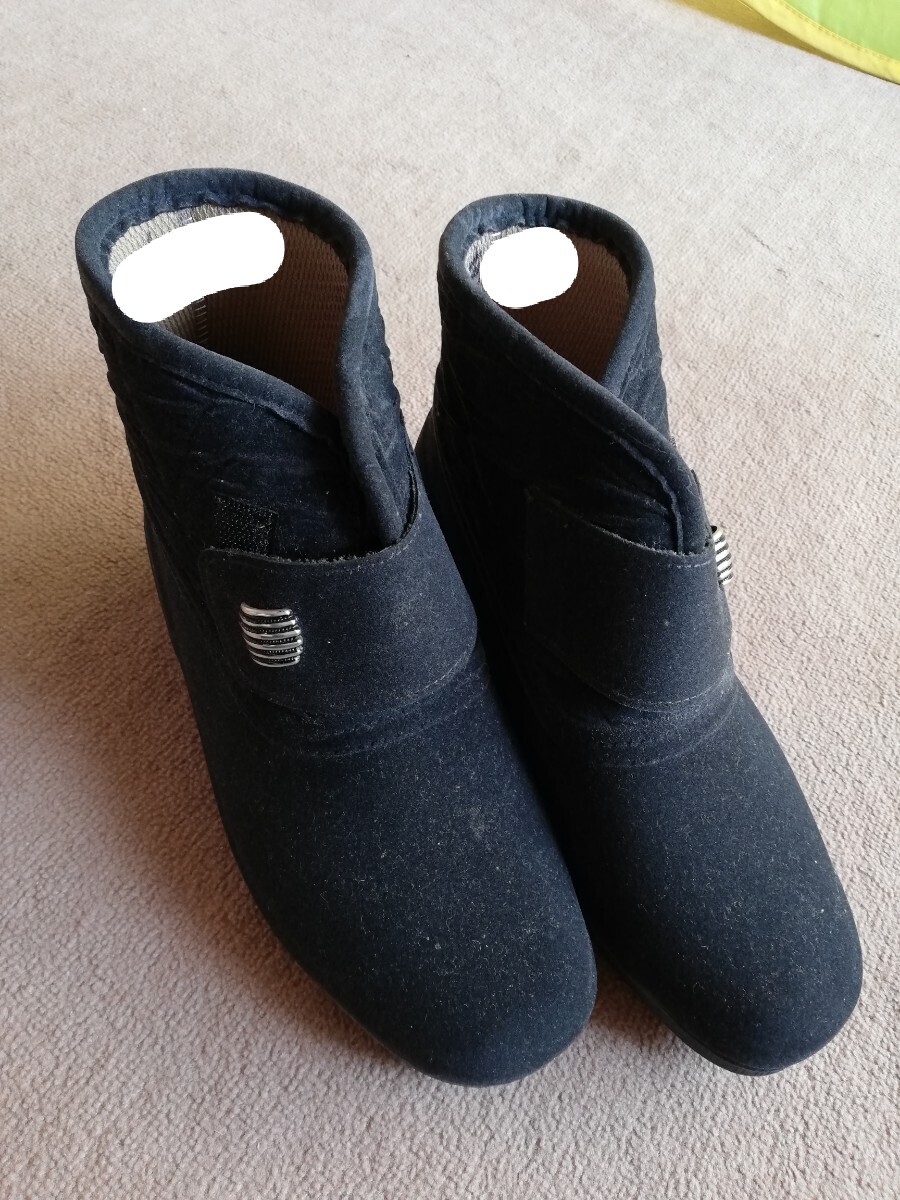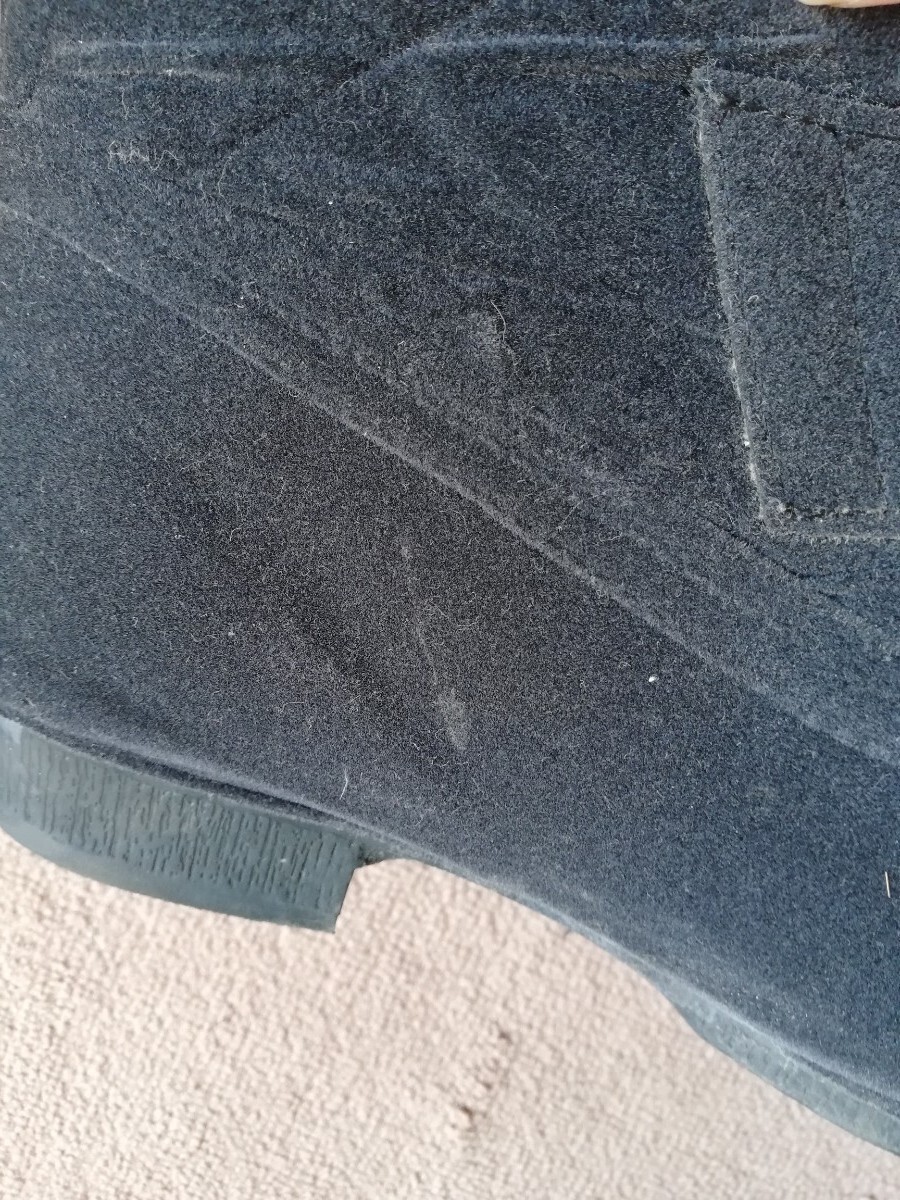 スエード素材の黒いショートブーツ、マジックテープで簡単に履ける!