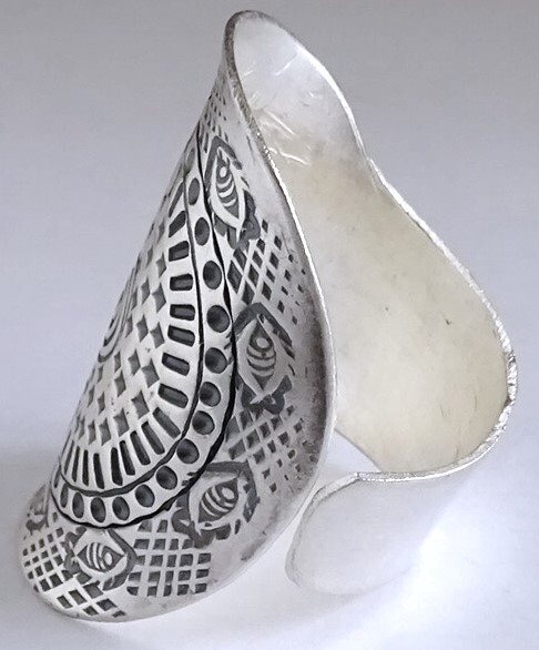 | タイ北部に住む山岳民族カレン族のシルバーリングです。 カレンシルバーの純度は非常に高く、1つ1つがハンドメイドで丁寧に作られており、個性的なデザインが特徴です。 ●サイズ:約23号 ※若干のサイズ調整可能 ●リング幅:約9mm~37mm |