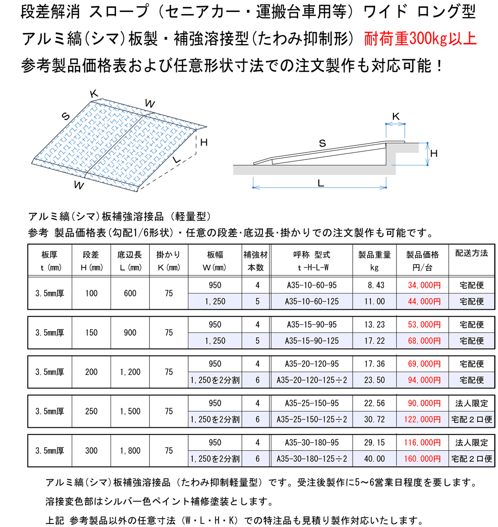 アルミ縞(シマ)板製・補強溶接型(たわみ抑制形) 段差解消スロープ(セニアカー・運搬台車用等)ワイド ロング型 オーダーメイド品A10 A11