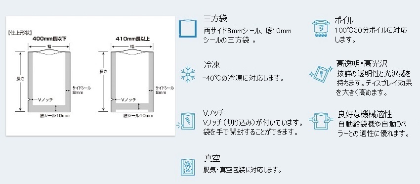 | 【 ここがポイント 】 ★温度帯を選ばず誰でも簡単に使えます。美しい光沢感、優れた透明性、しなやかな柔軟性、製法由来の内面衛生性を持った製品です! ★-40℃冷凍から100℃で30分ボイルまで一枚で対応し、独自技術の低カールは自動給袋適性良好です♪ ★丈夫な五層構造で両サイドと底部分をシールした三方袋。五層ながら、高い透明度と光沢感で中の商品を引き立てます。パック後の開封時はVノッチ(切り込み)が付いていて、袋を手で開封できます。 ★脱気・真空包装に対応します。柔らかな内容物も潰さず食感と風味を逃さず包みます。業務用としてテイクアウトの食品にお勧め♪お店自慢の味を自宅で楽しめます。ご家庭ではお一人様用に小分けして保存が可能です。