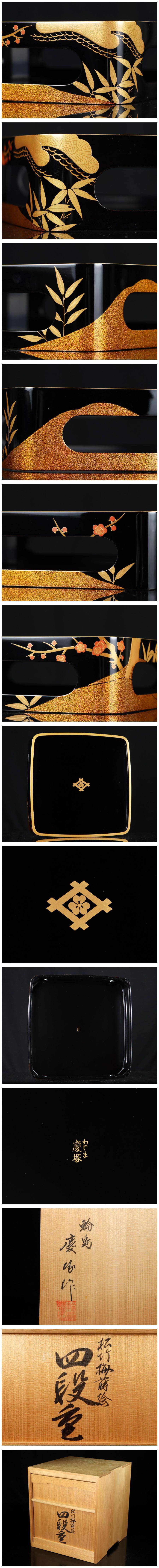 サイズ(約) 重箱:高さ 23.5㎝/横幅 19.5㎝/奥行 19.5㎝ 重台:高さ 6㎝/横幅 26㎝/奥行 26㎝ 重量 1.94㎏ 付属品 共箱 厳選最高級作品 本物保証 輪島塗 松竹梅蒔絵 四段重 台揃 蒔絵師わじま慶塚 高蒔絵 重箱 共箱 未使用 本物保証 蒔絵師を志した初代が大正八年に塗師屋に転向し、理想とする漆工芸を製作することから始まった輪島塗【慶塚】のお品になります。 輪島塗特有の艶やかな黒と梨子地が実に美しく気品漂う蒔絵重箱重台御膳です。 煌びやかな蒔絵にて、松竹梅が表現されています。 また、蓋の見込みにも朱塗りが施され、とてもおめでたい雰囲気の漂う逸品です! 細部まで緻密で贅沢な仕事が惜しげもなく注がれたお品で、お食事の席を素敵にご演出下さい。 底に「わじま慶塚」の銘有り。 状態、未使用になり極上の状態となりますが、僅かにスレ傷のある箇所ございます。 大変素晴らしい作品です!大事にしていただける方の入札お待ちしております。 |
