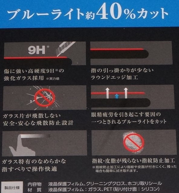 ガラス特有のなめらかな指滑りを実現するブルーライトカット仕様の液晶保護ガラスです。