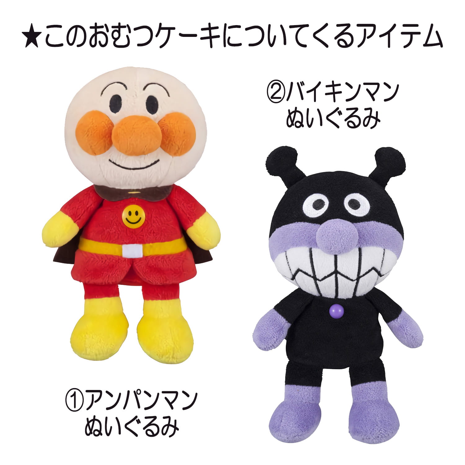 ●アンパンマンのぬいぐるみ×1 ●バイキンマンのぬいぐるみ×1 ●アンパンマン ウォッシュタオル×1 ●アンパンマン フェイスタオル×1 ●パンパース テープSサイズ 22枚 or Mサイズ19枚 ●デザインギフトボックス ●メッセージカード ●ギフトラッピング ●造花 ※造花、リボンのお色は弊社スタッフのコーディネートになりますので、画像とは異なる場合がございます |