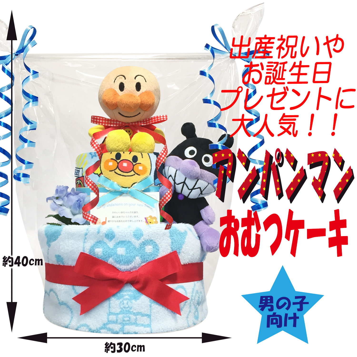 子供達に大人気のアンパンマンのタオルやぬいぐるみなどを1つ1つ丁寧に手作りされたおむつケーキのギフトです♪ 大人気のアンパンマンとパンパースの組み合わせで豪華なおむつケーキになっております。出産祝いやお誕生日プレゼントに大変喜ばれるギフトです。 ギフト用にラッピングを施し、可愛いギフトボックスにお入れしてお送りいたします。 おむつケーキに使われているおむつはお届け先の赤ちゃんやお母様にも安心していただける様に、衛生面にも考慮し、手を洗った後に手袋を着用し、1枚1枚個別包装してありますので、ホコリや湿気をしかっりガードいたします。 そのままお出かけにも持ち運べます。 ご購入していただいたお客様に満足して頂くことはもちろん、贈り先の赤ちゃんやお母さん、お父さんの幸せを願ってお作りいたしております。 |
