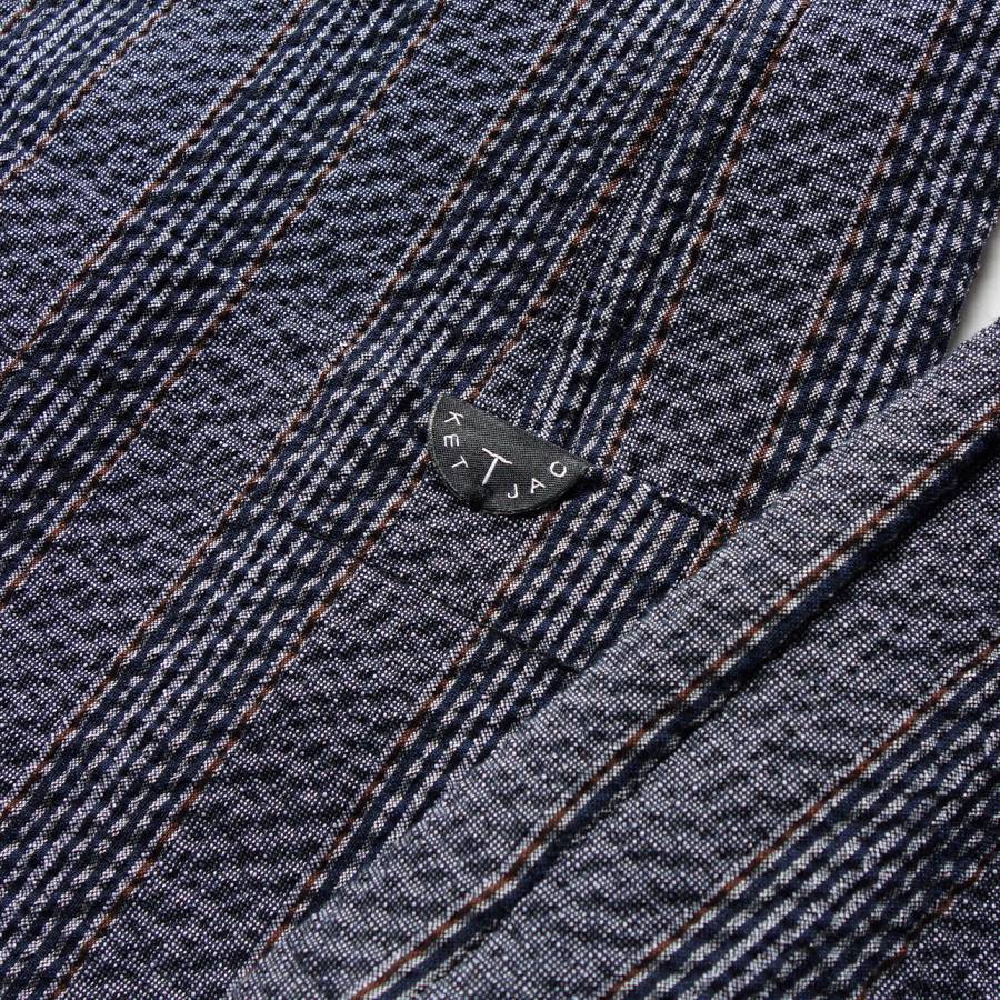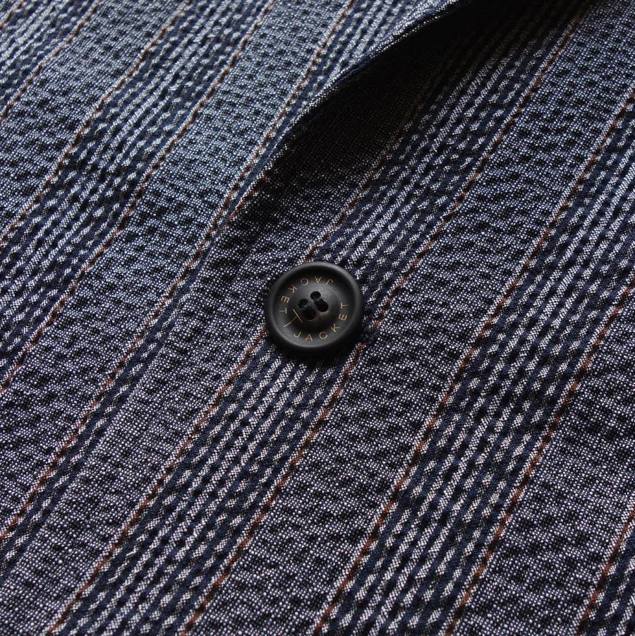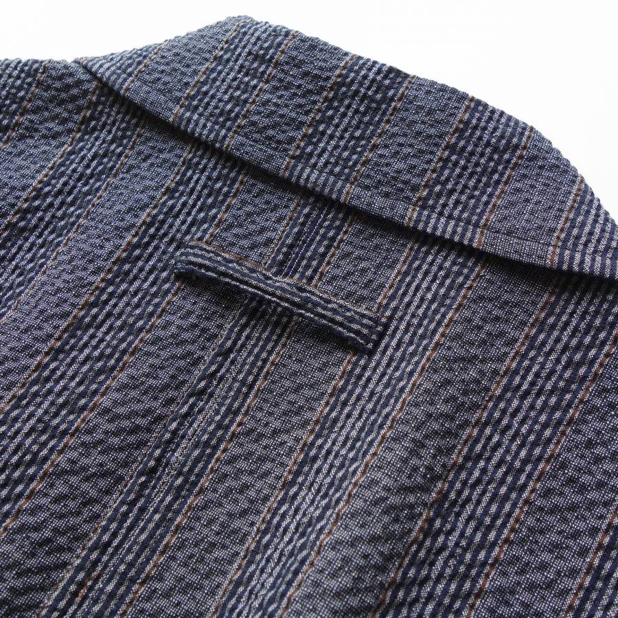 美しいシルエットや軽い着心地もさることながら、時代の空気を反映したオリジナルファブリックもT-JACKETが支持されている理由のひとつです。このジャケットに使用されているのは、厳選されたコットン素材から紡がれた細番手糸をしじら織りにした、夏の定番“シアサッカー”になります。シアサッカーは、経糸を一定の間隔をもってたるませることで生み出される“シボ”と呼ばれる波状のシワが特徴です。このシボによって生地と肌との接地面が少なくなり、汗をかいてもベトつかず涼しく感じる構造になっています。加えて、サラサラとした爽やかな肌触りなので余計に涼しさが増します。近年、化学薬品を使ってシボを生み出した安価なシアサッカーが出回っていますが、やはりシアサッカーは“本物(しじら織り)”に限ります。本物のシアサッカーは、生地にハリがあってシワや型崩れが起こりにくく長く愛用できます。もちろんストレッチ混なのでストレスフリーです。驚くほど軽くてラクチンな着心地ですよ。