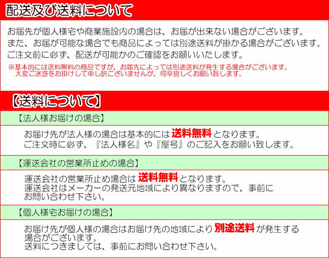 | (1).お届先が「北海道・沖縄・離島」(※商品によっては「東北」を含む)の場合は 別途送料が掛かります。 お届先の情報をもとに送料を設定させて頂きますので、お支払については 当店より送料のお知らせの後にお願い致します。 (2).一部商品については「個人様宅」へのお届の場合、別途送料が掛かる場合が ございます。 (3).送料のお問い合わせの際は、以下の情報をご連絡下さい。 ・お届け先の郵便番号 ・お届け先が「個人様宅」or「法人様」 |