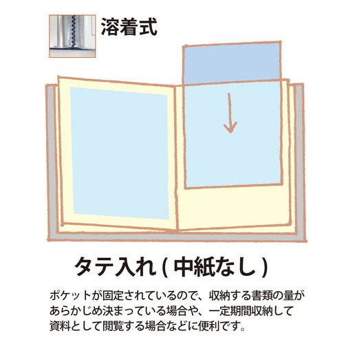 中紙なしで実用本位のローコストタイプ。どんどん使ってきれいに整理。背ラベルの背面はシンプルなデザインで書き込み可能。ポケットは厚手のエンボスフィルム。