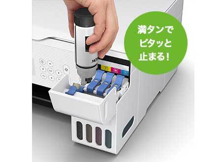 ボトルを挿すだけですぐにインク補充が開始されます。満タンになると自動で止まるので手も汚れにくく、手間もかかりません。さらに、タンクとインクボトルの注入口の形状が色ごとに異なるので、入れ間違いも起こりません。