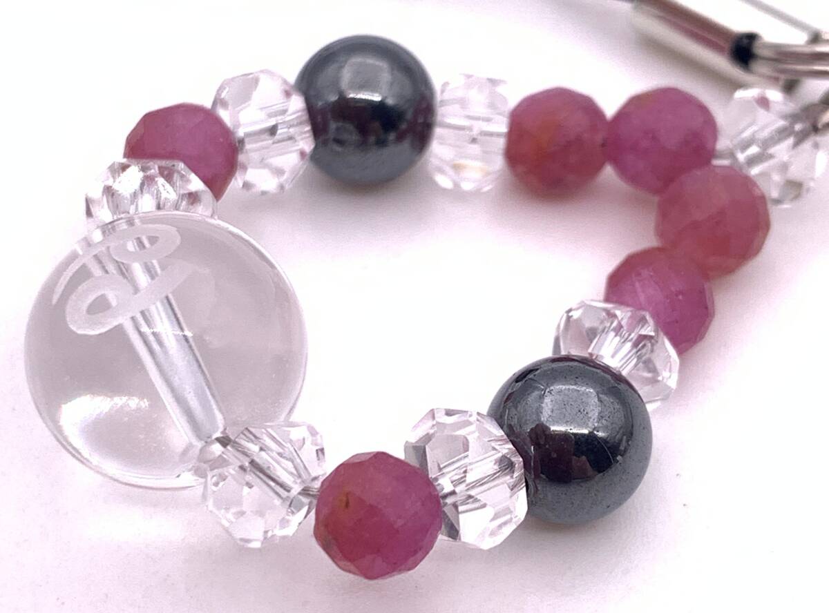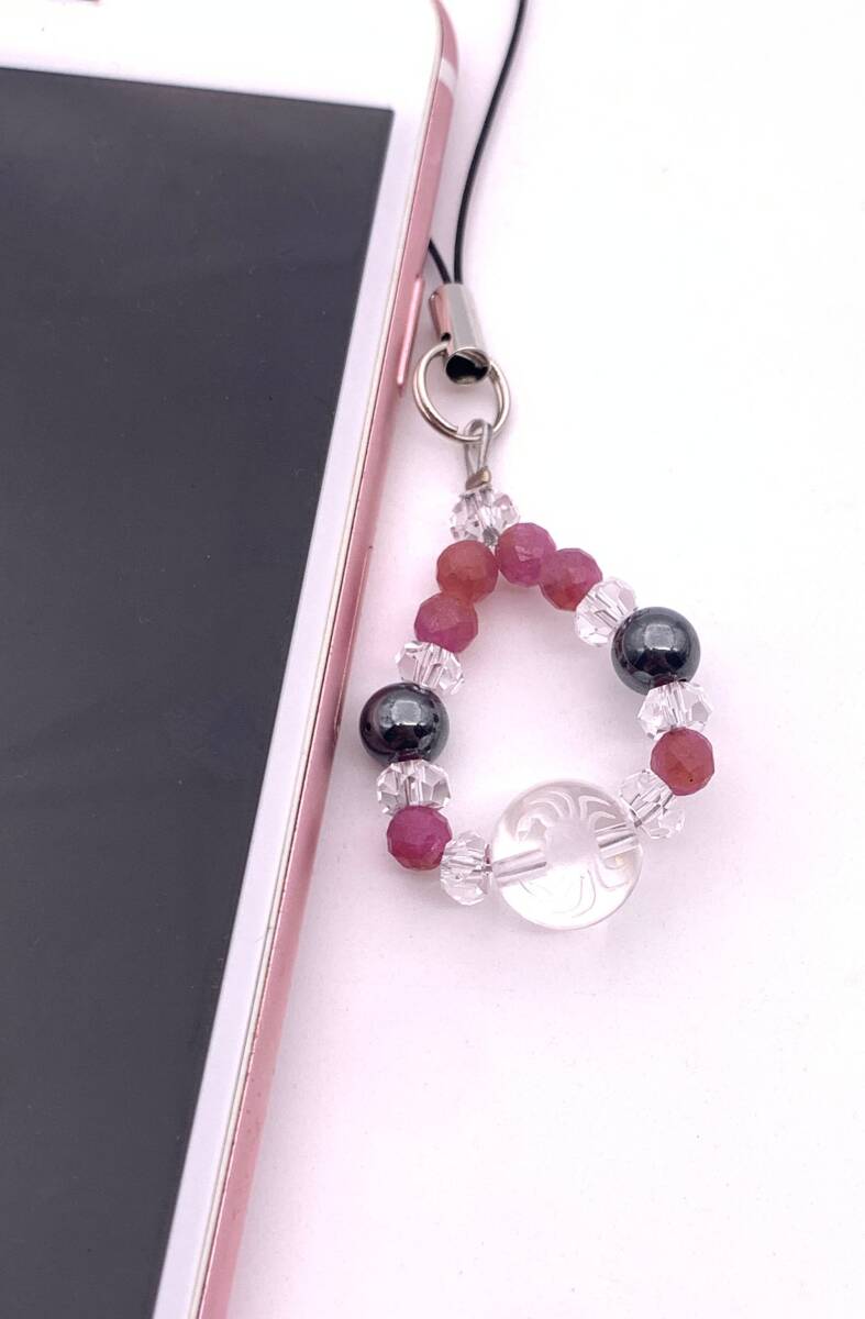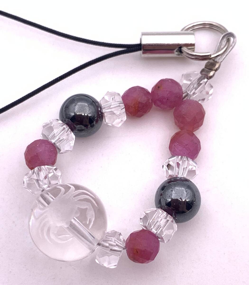 天然石彫り水晶12星座(かに座)&ルビー&ヘマタイトのストラップ
