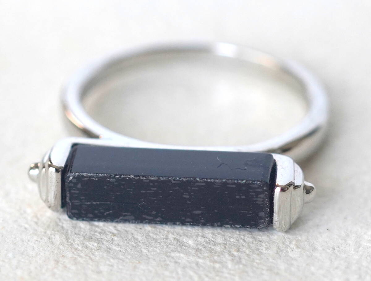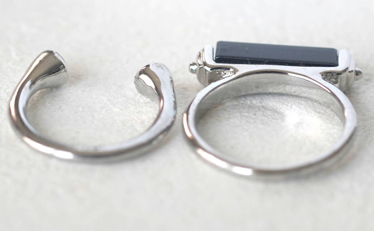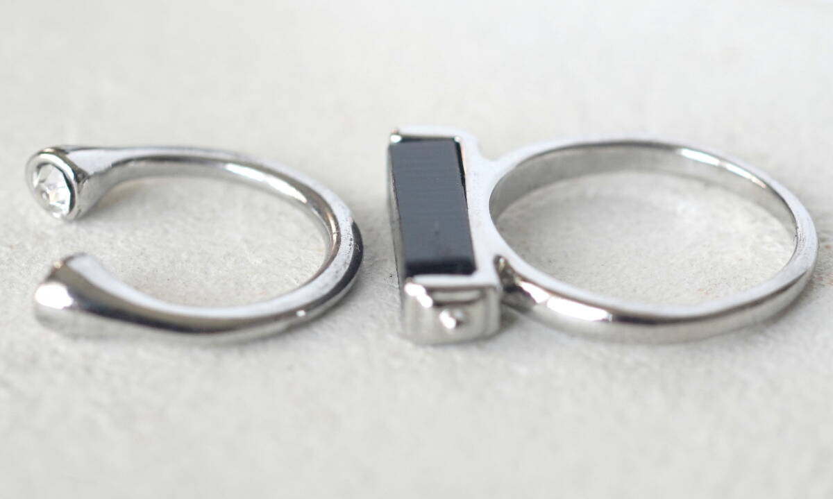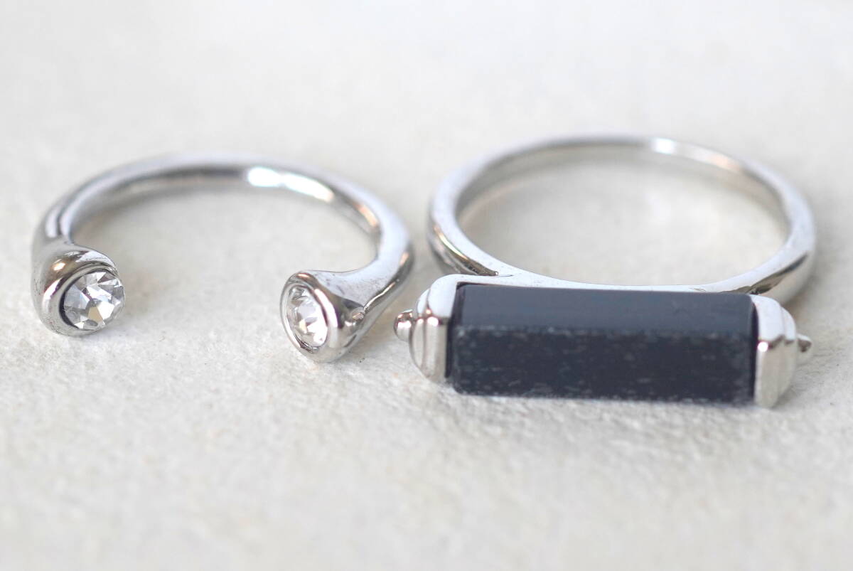 黒い細長い直方体がついたリングと、ラインストーンが二つ付いたリングです。