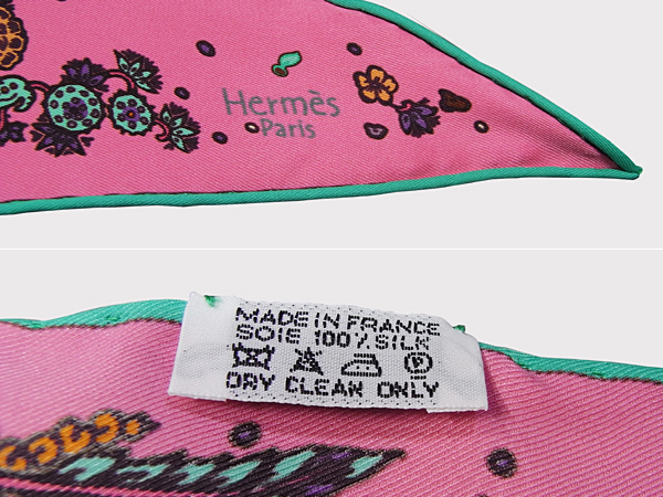 | 特徴 | 三角スカーフ「ファンタジーインディアンズ」シリーズの、美しいピンク色の三角スカーフです。幻想的な鳥や植物が独特なタッチで描かれています。2008年春・夏コレクション。「2008 Fantaisies Indiennes」プリントあり。フランス製 | ||