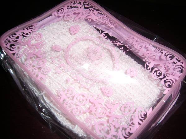 ・大きさ(縦 約 12.5㎝ X 横 約 17㎝ X 厚さ 約 5.5㎝)、色(透明、ピンクの薔薇柄)
