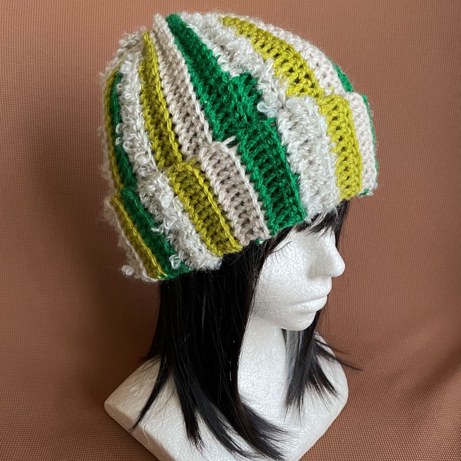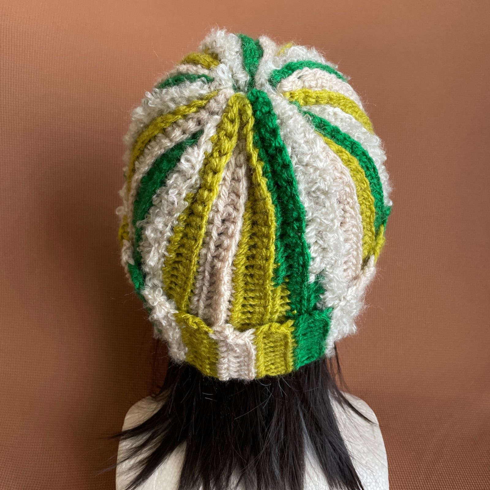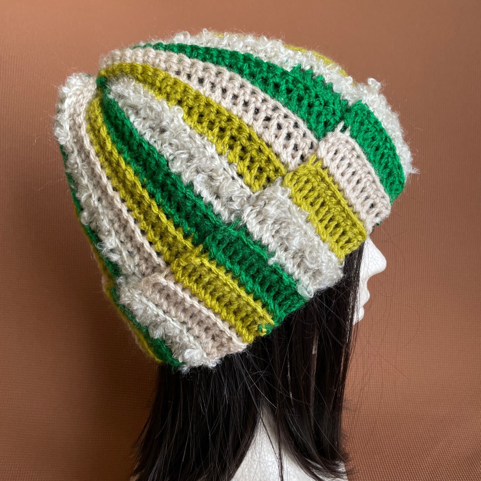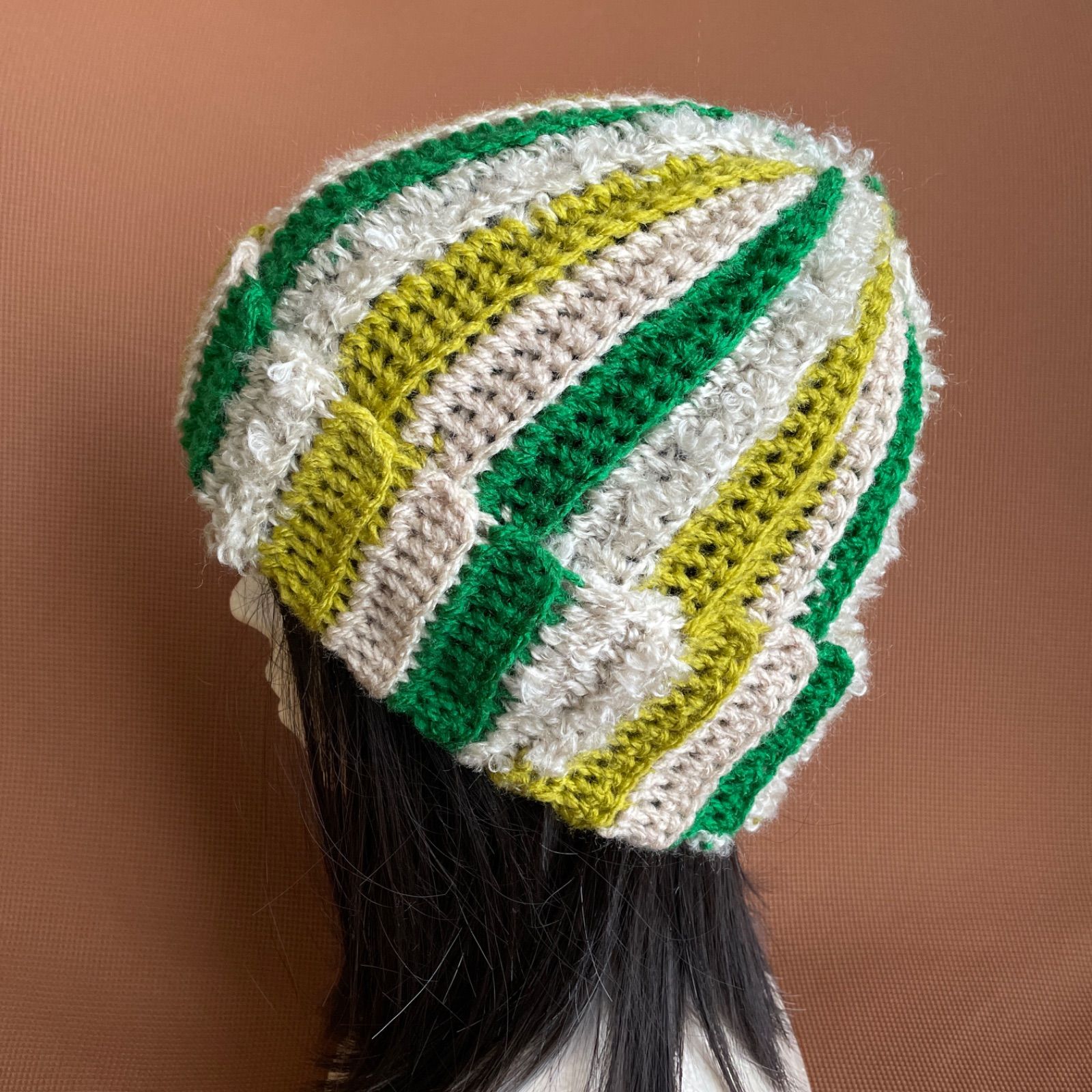緑、黄緑茶、ベージュの糸で編んだニット帽です