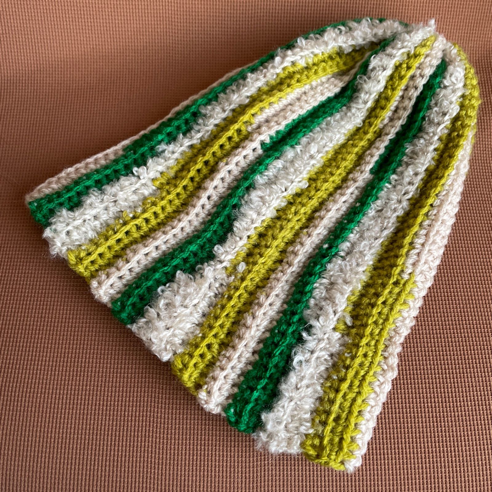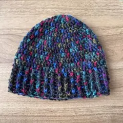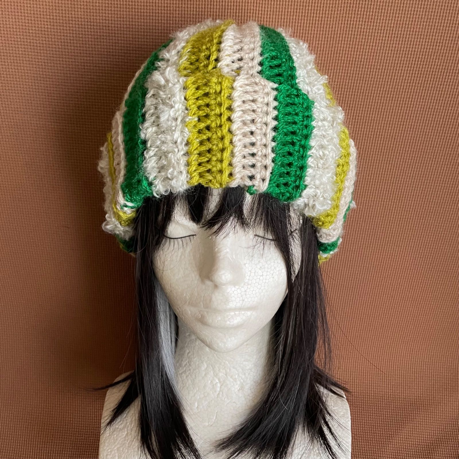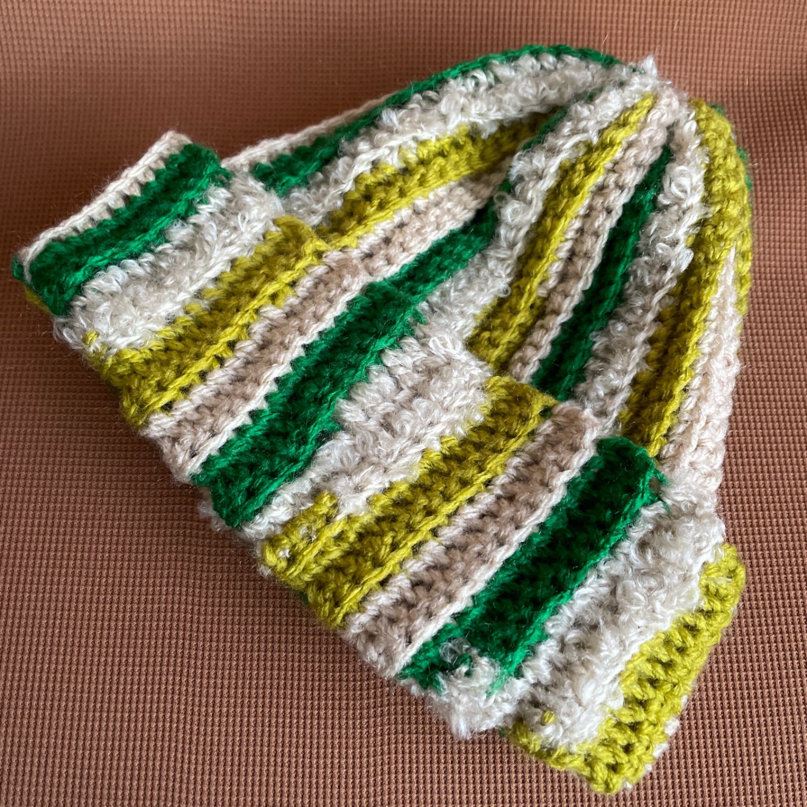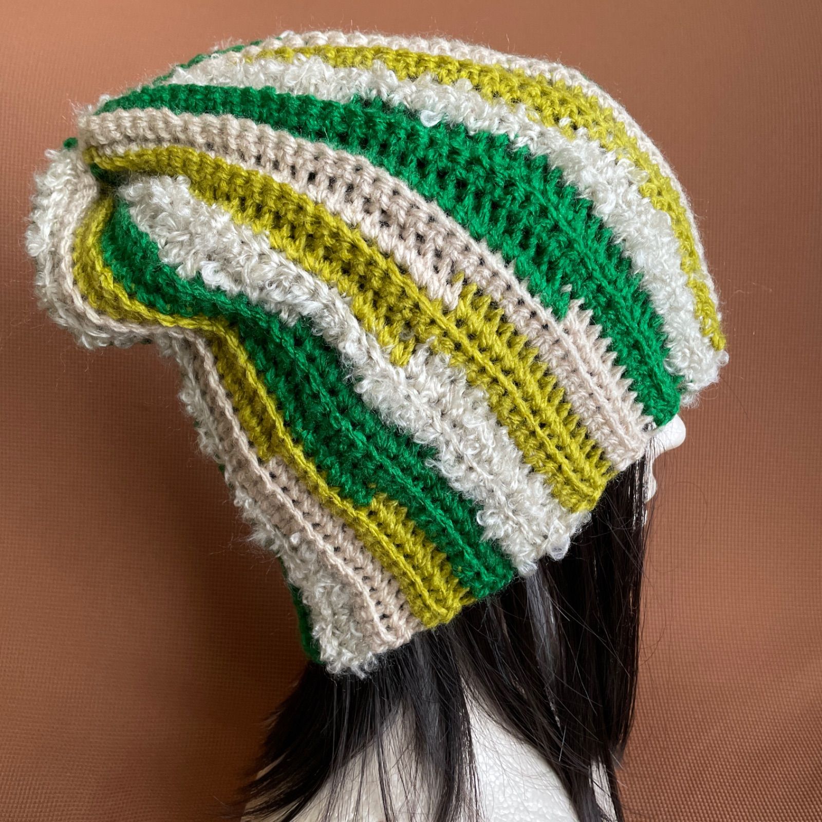 緑、黄緑茶、ベージュの糸で編んだニット帽です