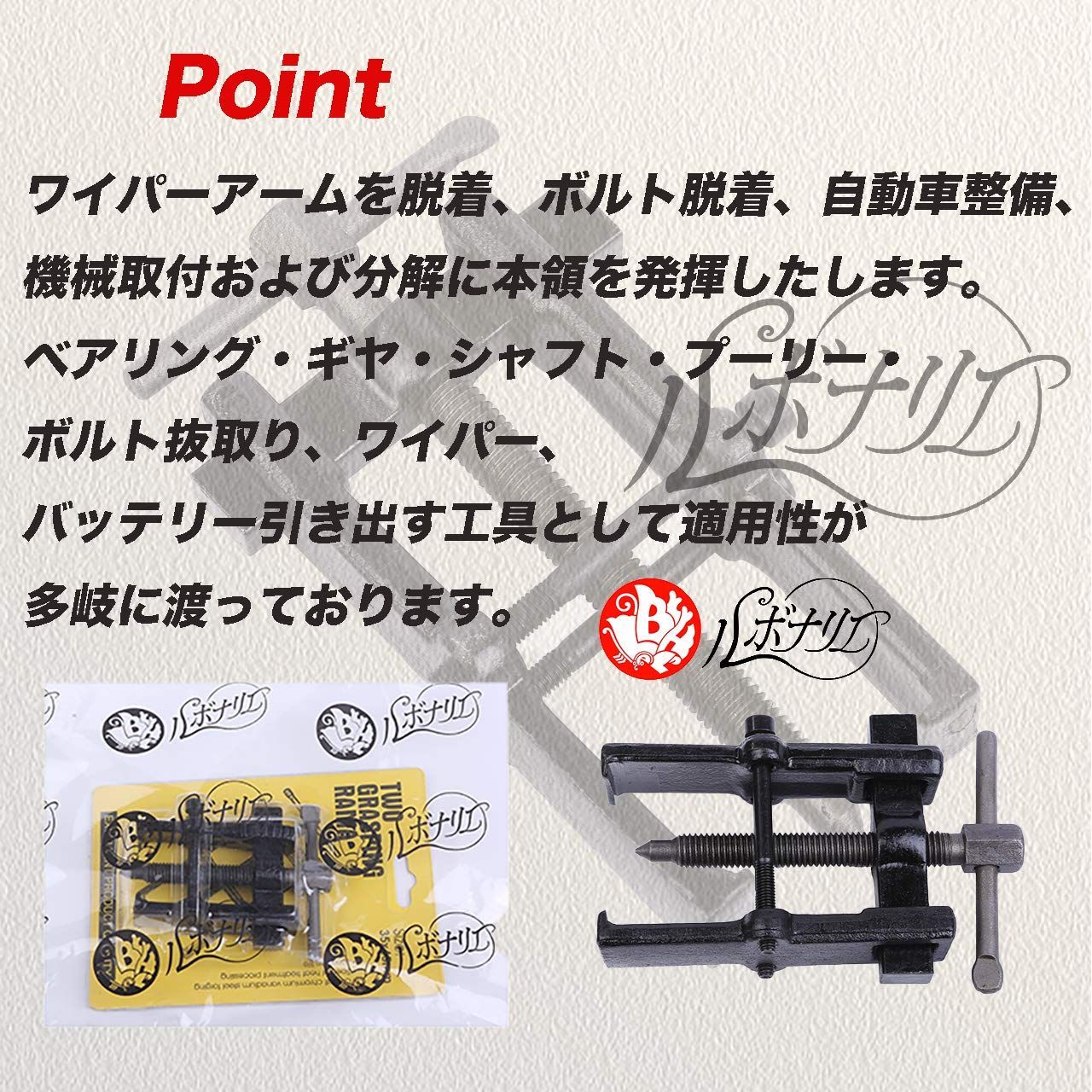 ワイパーアームを脱着、ボルト脱着、自動車整備、機械取付および分解に本領を発揮したします。ベアリング・ギヤ・シャフト・プーリー・ボルト抜取り、ワイパー、バッテリー引き出す工具として適用性が多岐に渡っております。