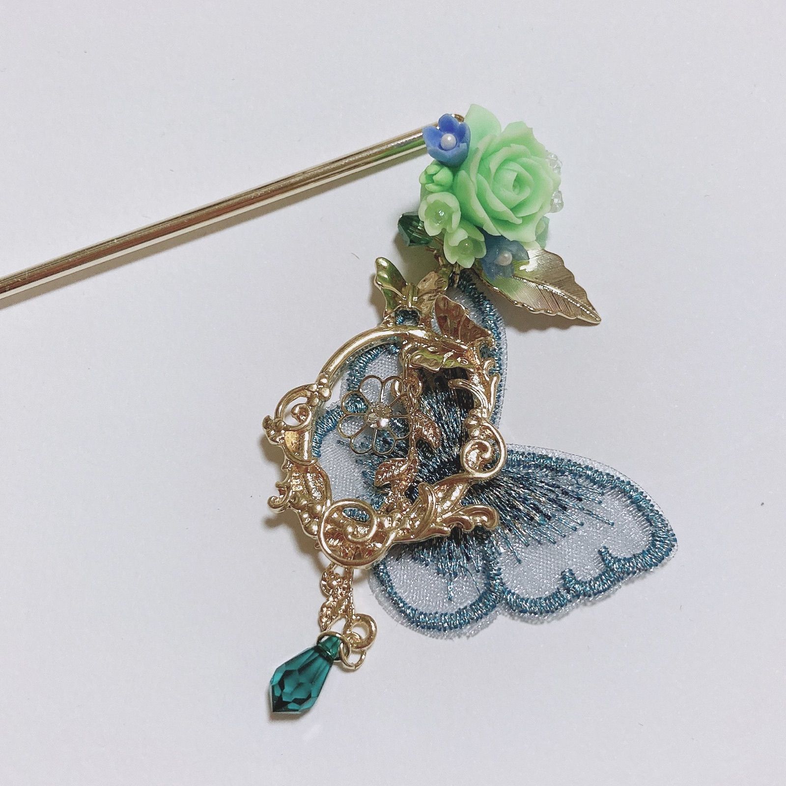 金属チャームとスワロフスキーの組み合わせで作り上げました。かんざしです