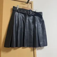 PUレザー プリーツ ハイウエスト スカート、スリム Aライン フレアスカート