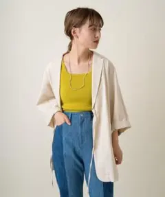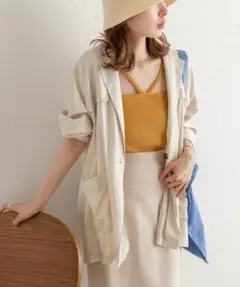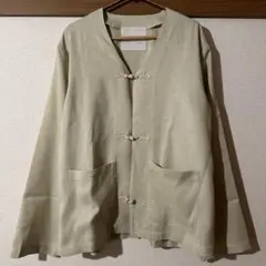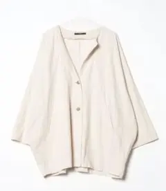 アイボリーのノーカラージャケット、柔らかい生地でカジュアルなスタイルに最適。