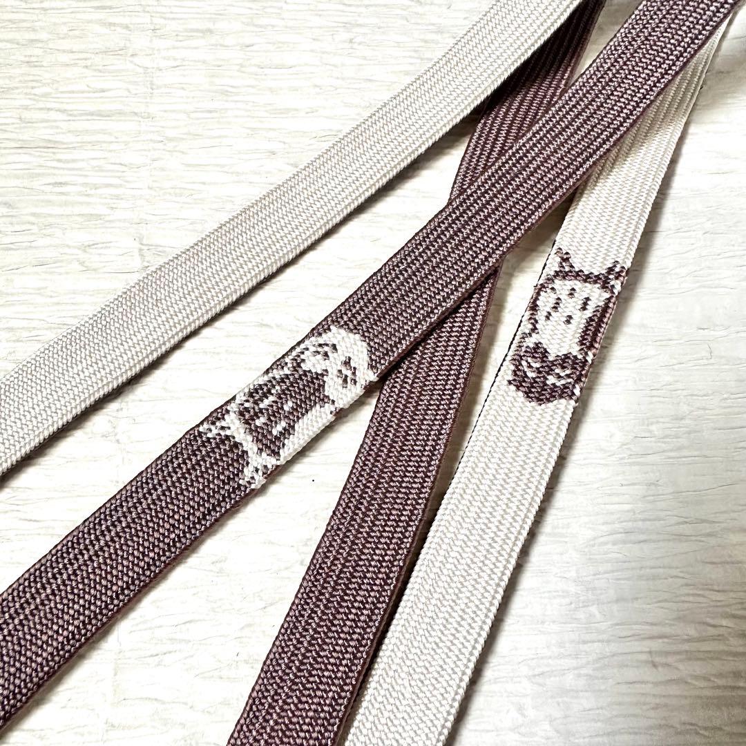 小豆鼠×白にほんわかした表情の梟が2羽、片側に綾出しされた高麗組の帯締めです。
