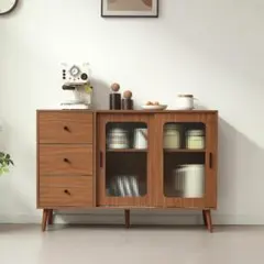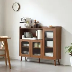 【雰囲気を格段にアップさせるグラス扉】グラス扉はキッチン雑貨や食器をインテリアに変え、空間をワンランク上の雰囲気に仕上げます。モダン、北欧、レトロ、どのスタイルにもマッチします。三段可動棚棚板は3cm刻みで調整可能、収納したい物の大きさに合わせて動かせます。