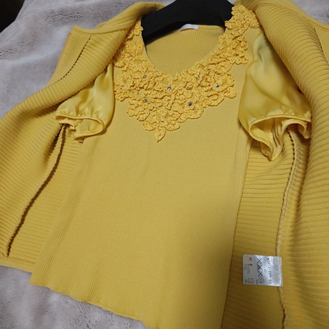 このカーディガンは明るい黄色で、春夏のコーディネートにぴったりです。ビーズ付きの刺繍が施されており、華やかさを演出します。