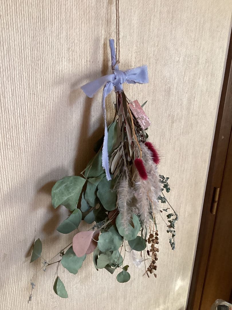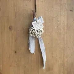 使用されているドライフラワーは、耐久性があり、長期間楽しむことができます。リボンはライトブルーで、全体のデザインに柔らかさを与えています。