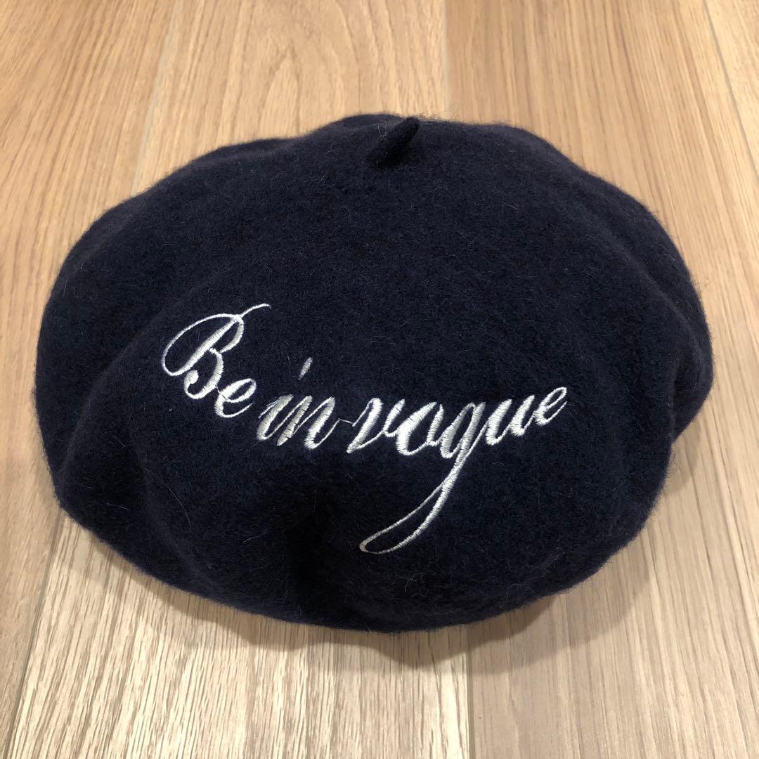 ネイビーの刺繍入りベレー帽、スタイリッシュなデザイン。
