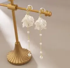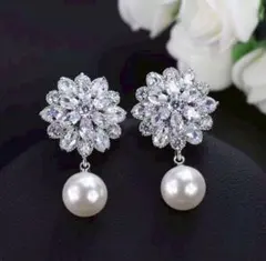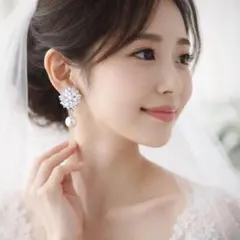 華やかなパールと大きめなフラワーのデザインのイヤリングがウェディングに最適です。