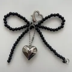 シルバーのメタル製リボンにハート型チャームが付いたユニークなデザインのアクセサリー。