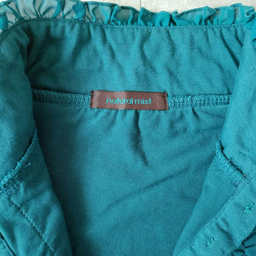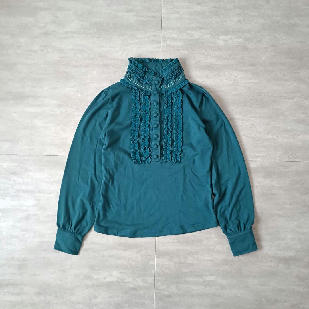 フロントにあしらわれた縦フリルと包みボタンが、上品でフェミニンな雰囲気を演出。深みのあるグリーンカラーが大人っぽく、1枚着はもちろん、ニットやジャケットのインナーにも映える万能アイテムです。