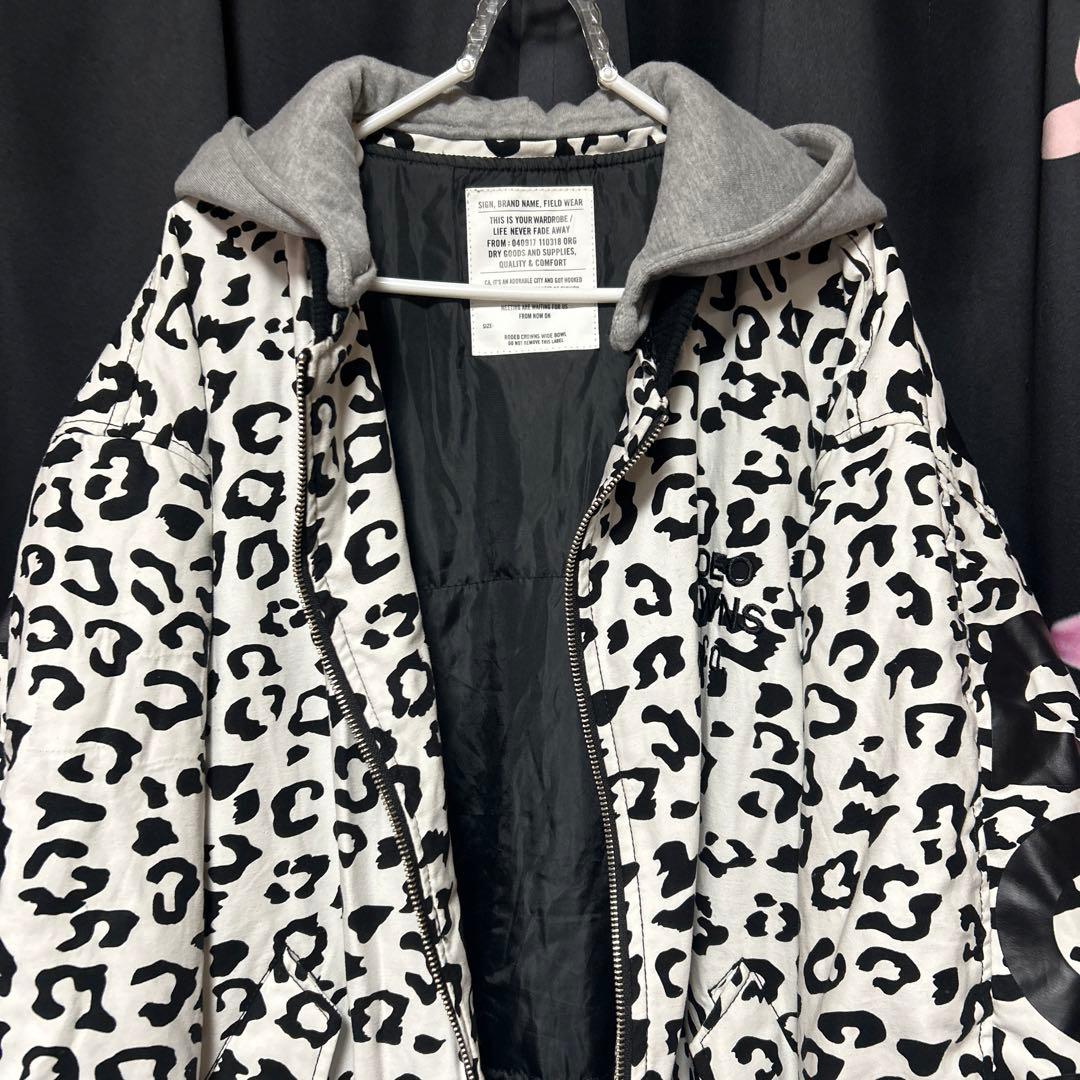 ゆったりとしたオーバーシルエットのサイズ感。KHA・BLKは無地で、柄WHT・柄BRNはレオパード柄で登場。中綿も入っているので秋から冬にかけて着用出来ます。裏毛のフードは取り外し可能で、2WAYで楽しめる一着。