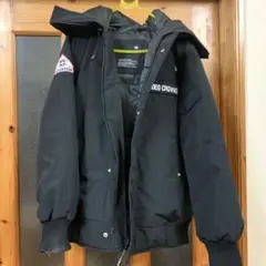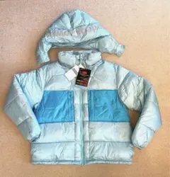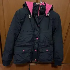 レオパード柄の中綿入りジャンパー、グレーのフード付きでスタイリッシュ。