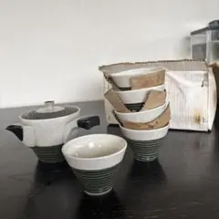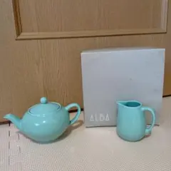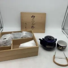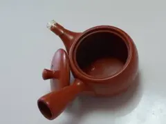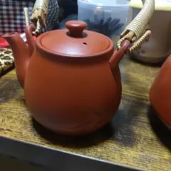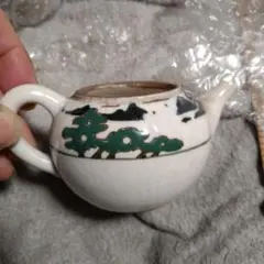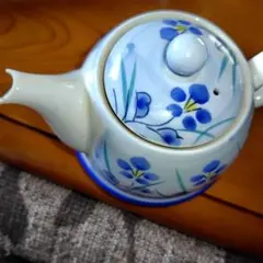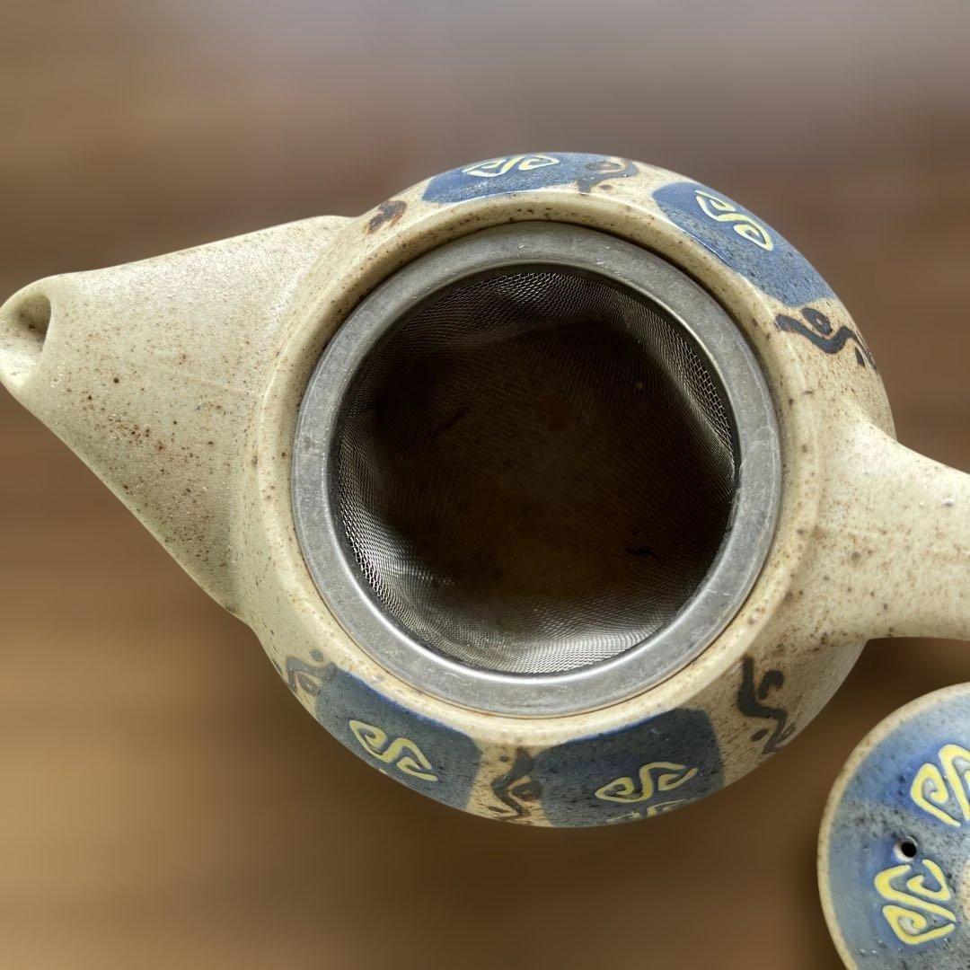 青と黄色の模様が特徴的な陶器製急須、茶こし付き。