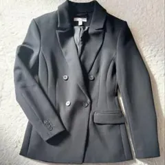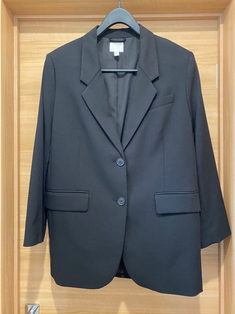 シンプルなブラックのテーラードジャケット、ボタン付きでポケットもあり、カジュアルからフォーマルまで幅広く活躍します。