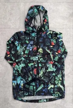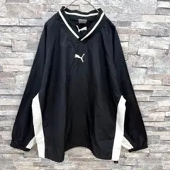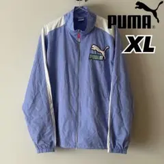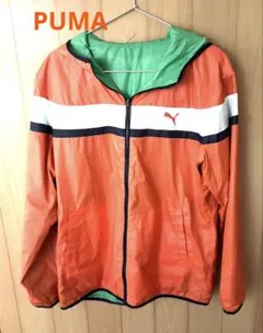 PUMAのホワイトストライプナイロンジャケット、フード付きでスポーティなデザイン。
