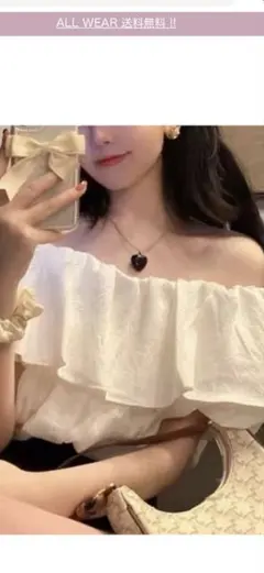 オフショルダーのシャーリングデザインで、パフスリーブが特徴的なグレーのトップス。