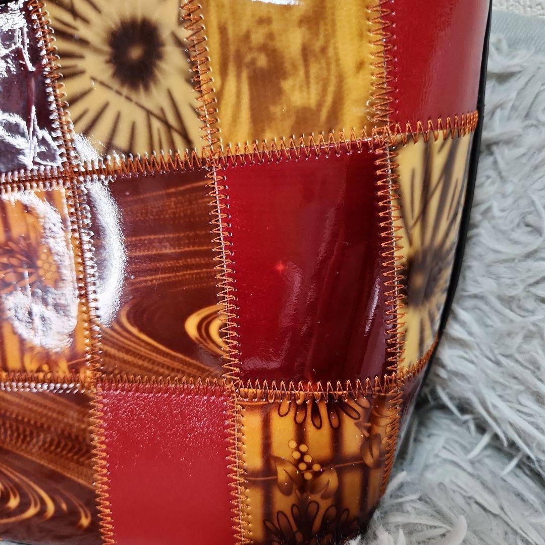 素材: このバッグはプレミアムな牛革で作られており、パテント仕上げ(エナメル加工)とパッチワークデザインが特徴です。