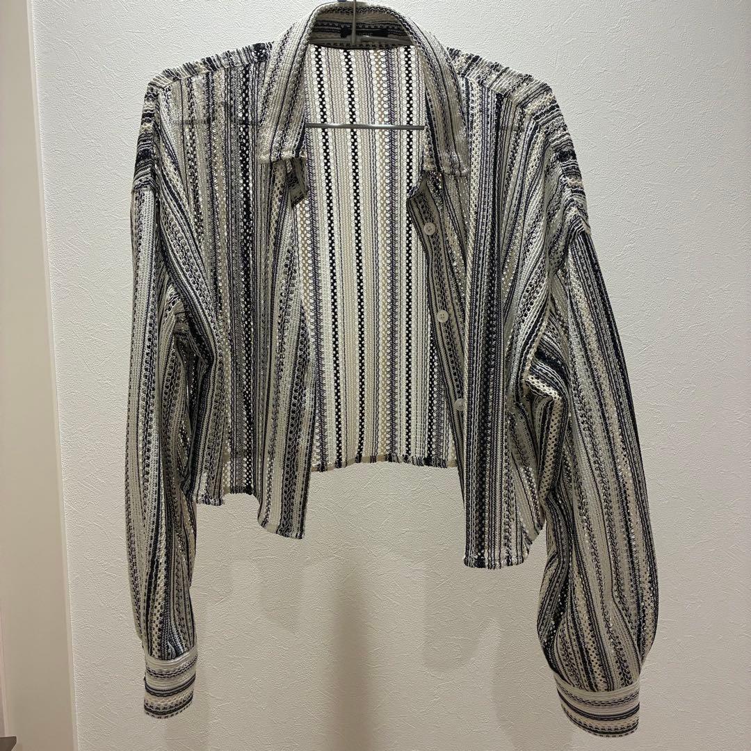 未着用品 ストライプ カギ編みクロップドシャツ 長袖 ネイビー ホワイト