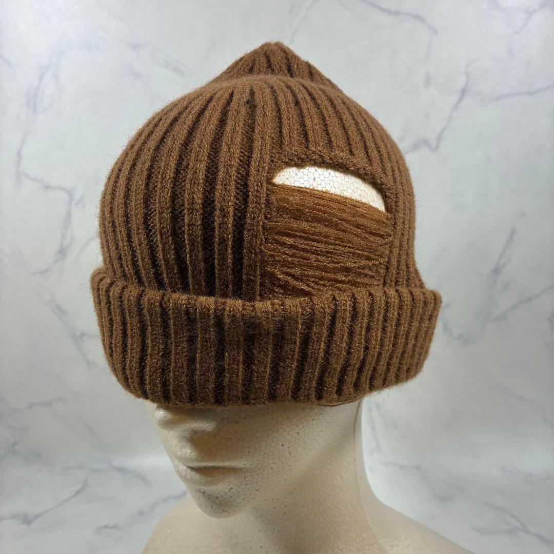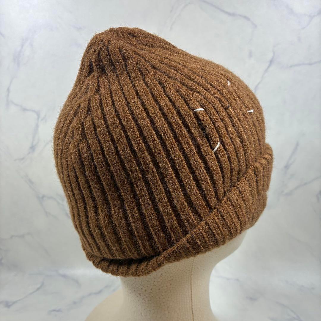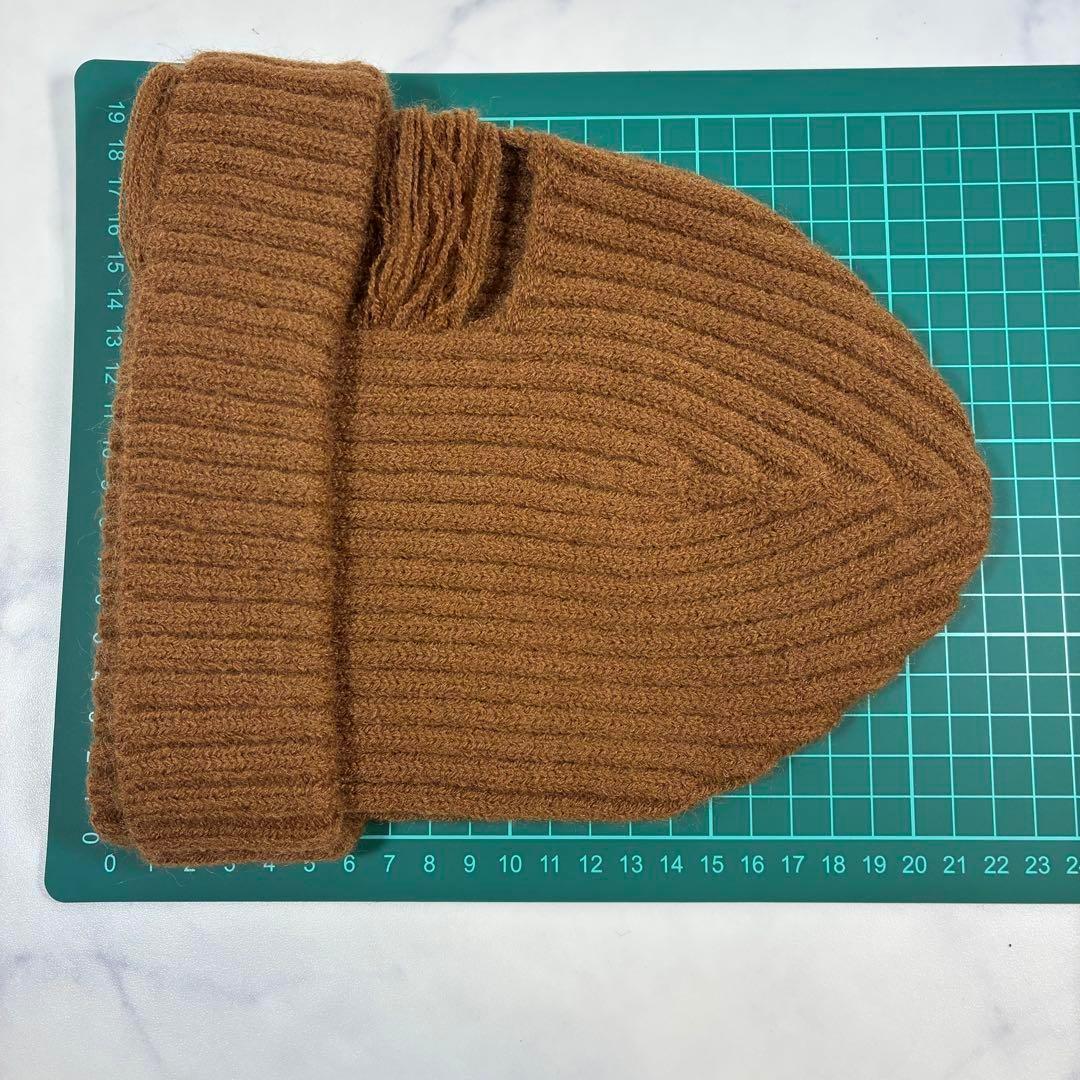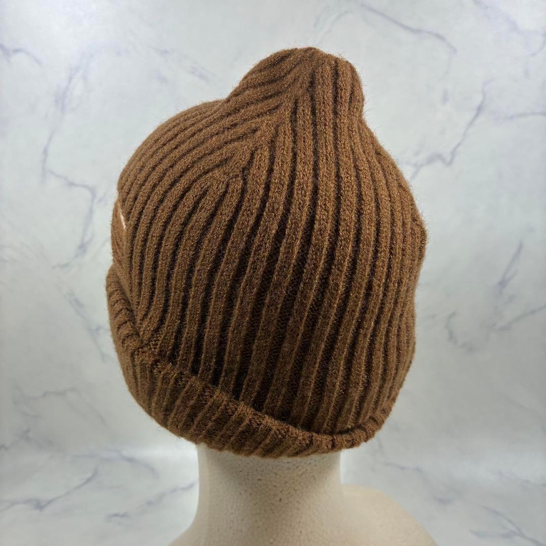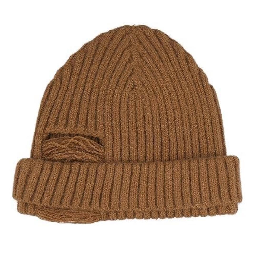 リブ編みデザインのキャメルニット帽、カジュアルスタイルに最適。