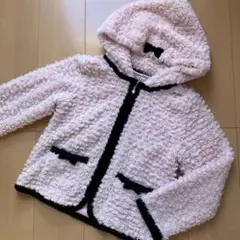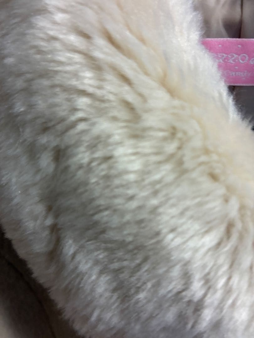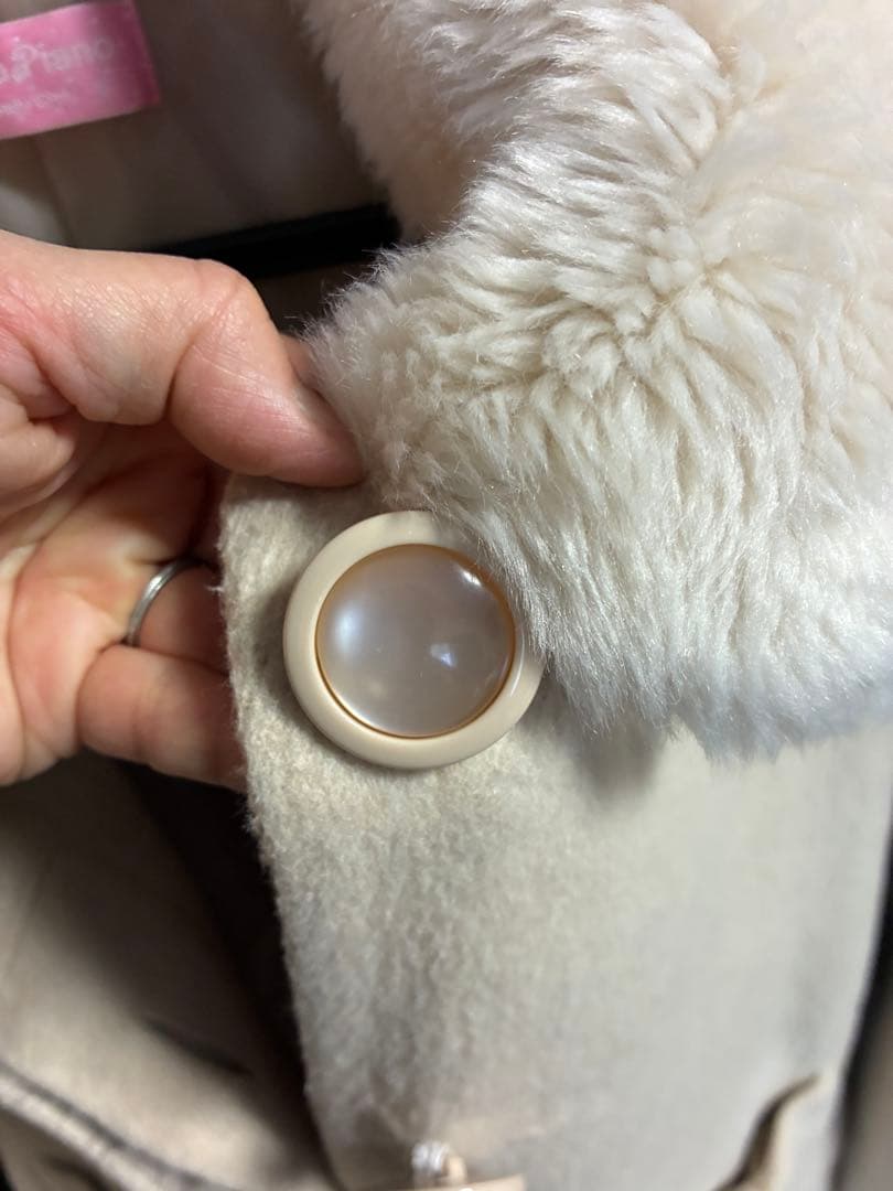 クリーム色のファー付きコート、リボンポケット付き。
