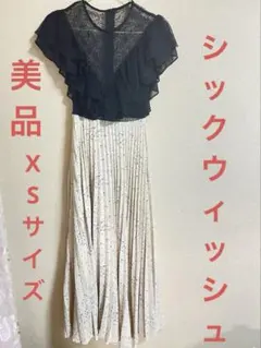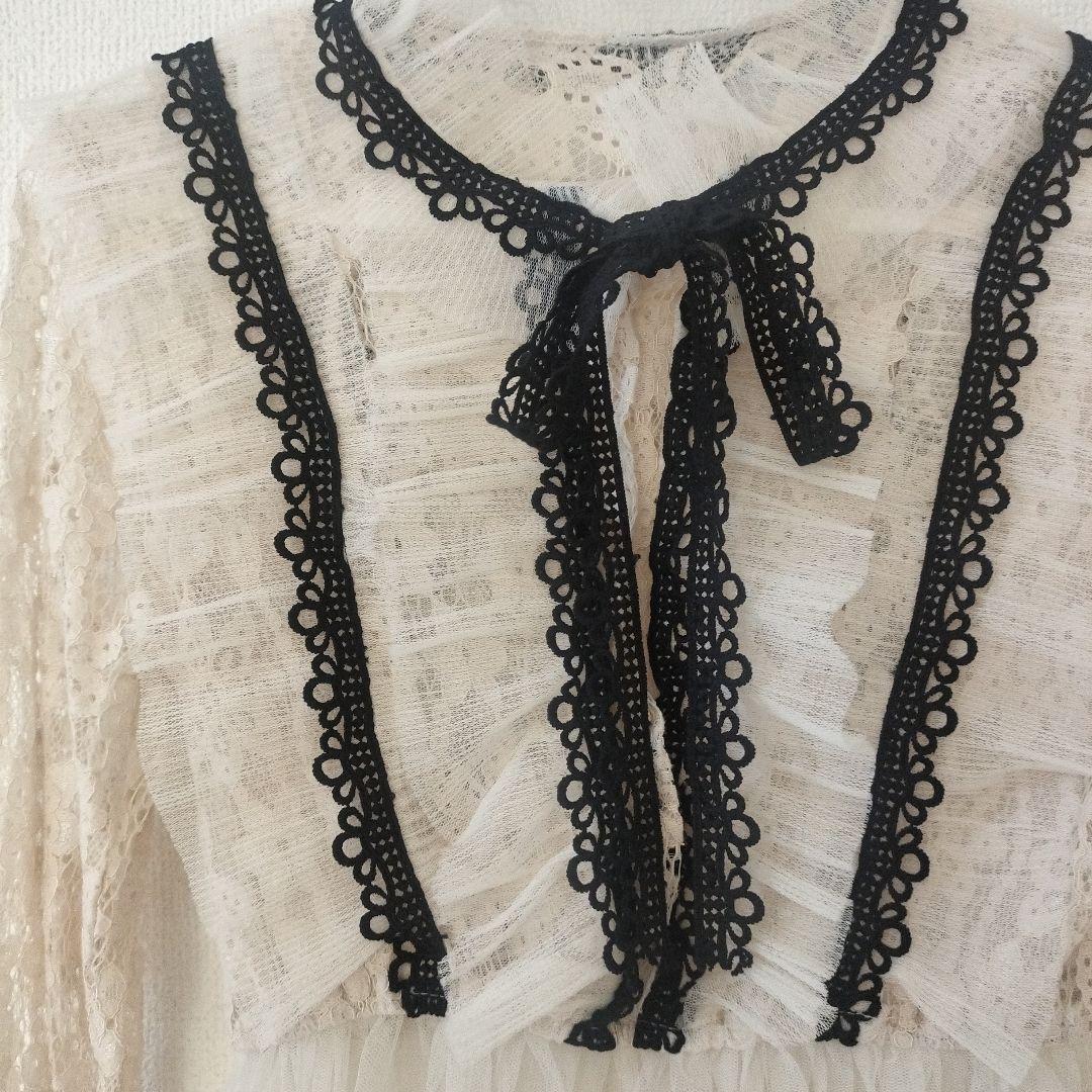 アイボリーと黒のレースとシフォンのドレス、リボン付きのデザインが特徴。
