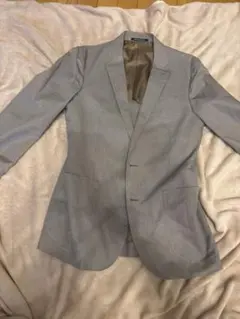 グレーのチェック柄ビジネスジャケット、2つボタン仕様でスタイリッシュなデザイン。