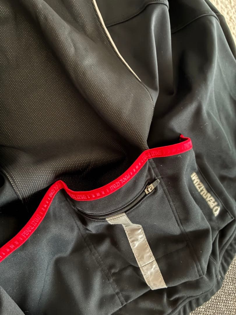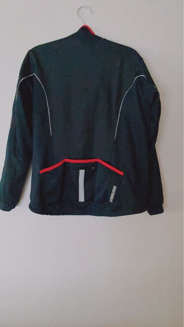 ジッパー付きのデザインで、襟は赤色のアクセントがあり、スタイリッシュです。反射ストライプが付いており、夜間の視認性も高めています。