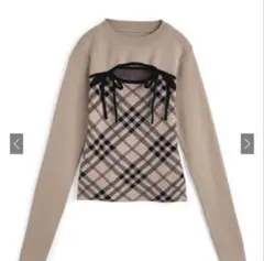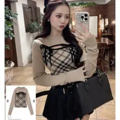 チェック柄フロントオープンリボンニットトップス[ru1374]