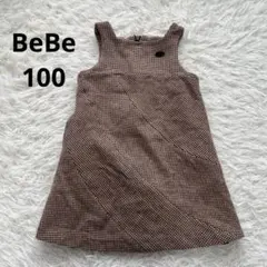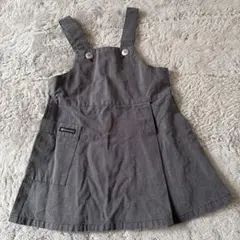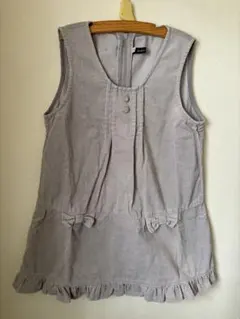 調整可能なストラップとフロントポケットが特徴のベージュのジャンパースカートです。